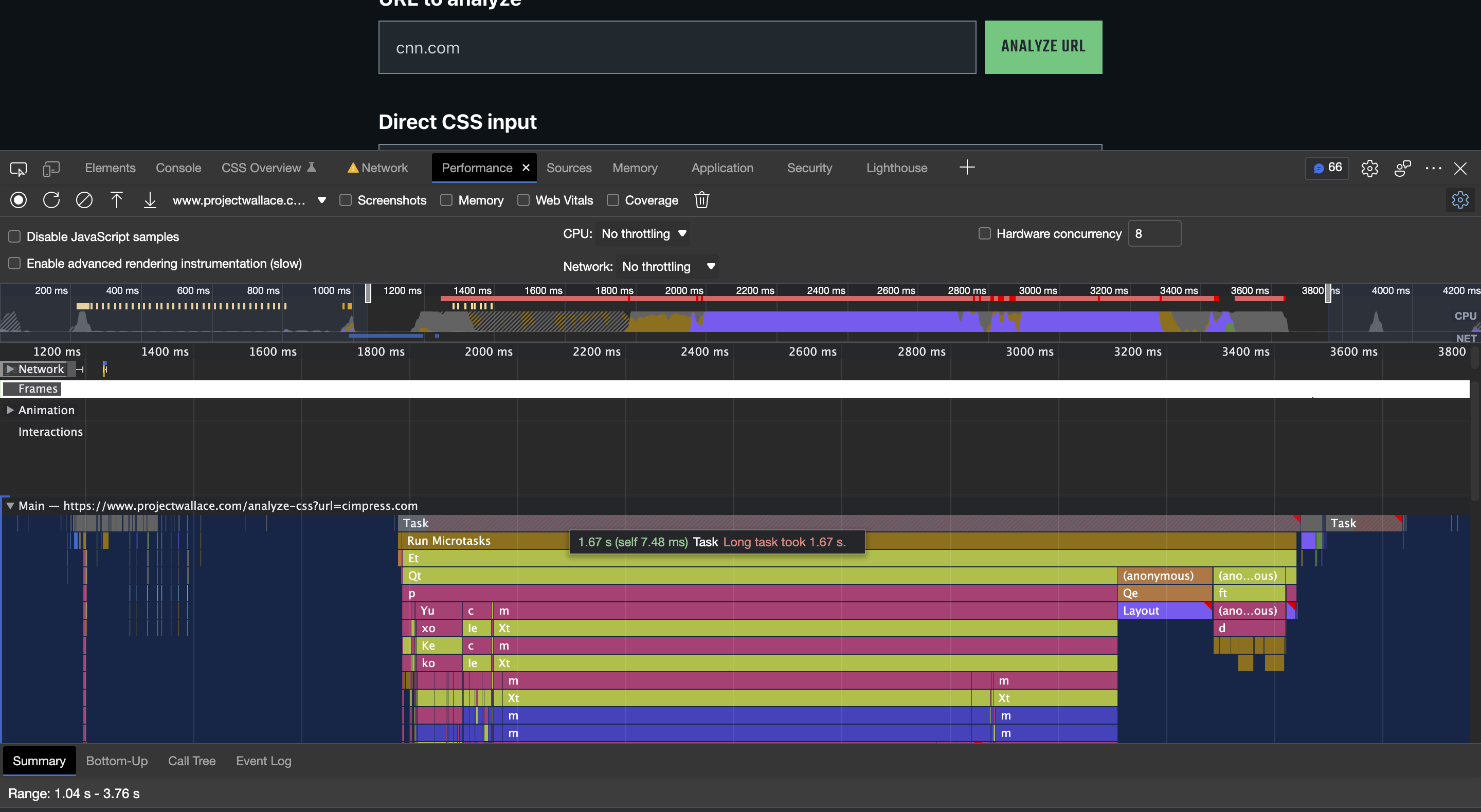 One of the main drivers for Project Wallace is performance. Not just analyzing the performance of CSS as you can see in our code quality tools, but also doing the work in a fast and efficient way. With all the extra analysis that we’ve added over the last year, the analyzer page started to become a little slow. Even though the analysis happens completely off the main thread using a WebWorker. But rendering the results on the page sometimes took longer than parsing and analyzing the CSS itself! So I set out to fix that and the result is that the CSS report now renders more than 6 times faster than before! Here’s what I found.