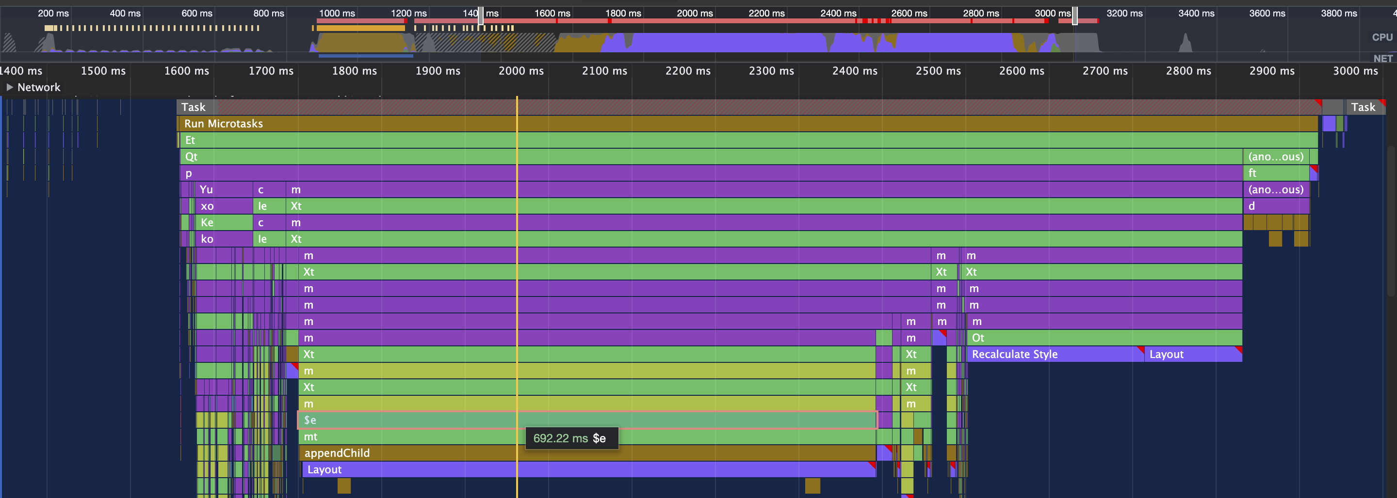 The image also shows two big blocks of Recalculate Style and Layout, taking up 150ms and 50ms. I have yet to find out what they mean, but I think it’s the document trying to paint the generated report to screen. The tall block on the left is what would previously take up all space and look at it now: it’s tiny in comparison.
